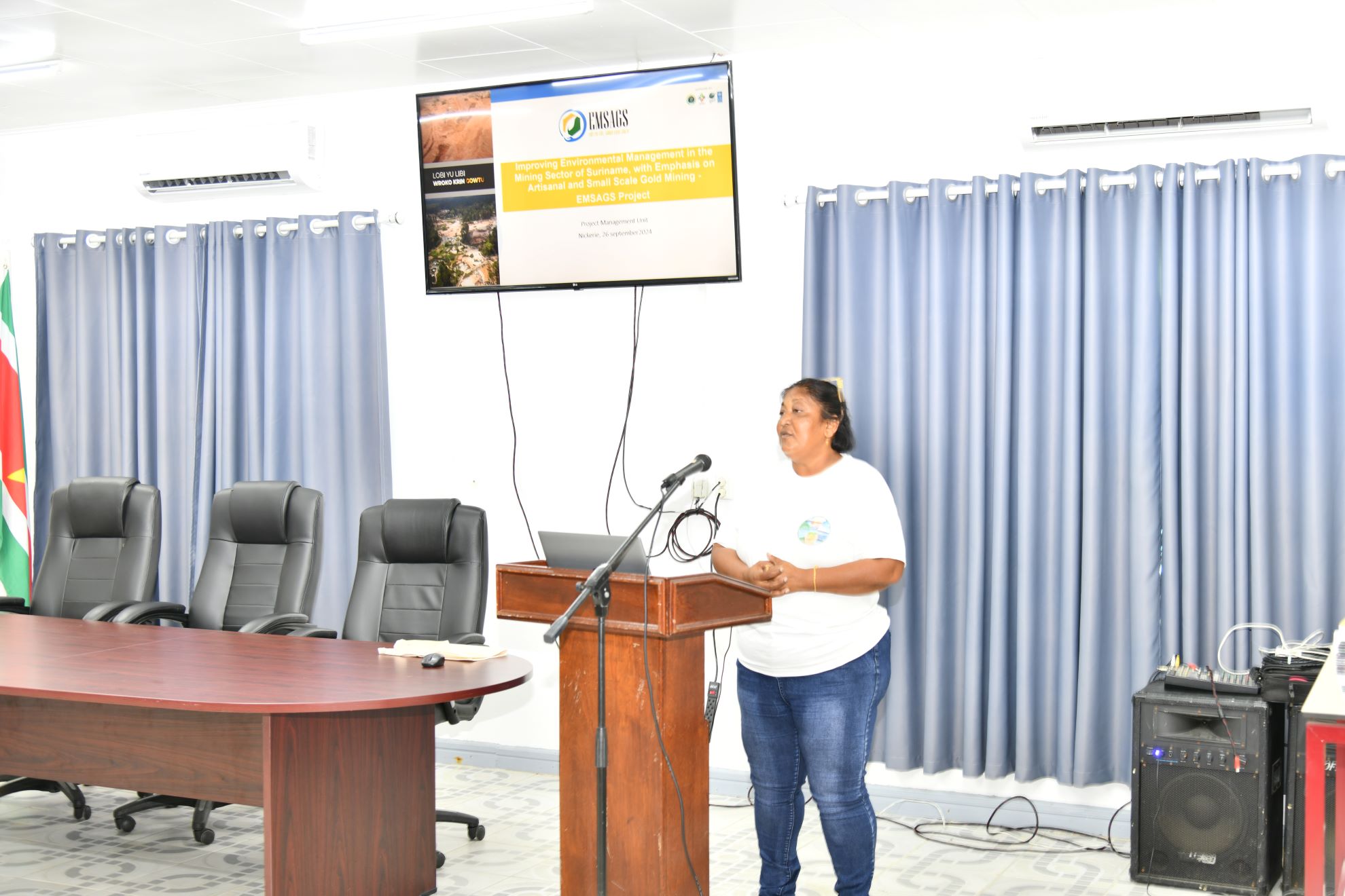 Het vergroten van het bewustzijn van belangrijke stakeholders over de negatieve impact van "business as usual" in vergelijking met milieuverantwoordelijke ambachtelijke en kleinschalige mijnbouw (ASGM) is cruciaal voor het EMSAGS-project. Op 26 september 2024 vond er een informatiesessie plaats voor het commissariaat van Nickerie. Tijdens deze sessie werden de deelnemers geïnformeerd over het EMSAGS Project. Wat de doelen zijn en welke stappen de overheid onderneemt om het milieubeheer van mijnbouw in Suriname te verbeteren, met name kleinschalige goudwinning, die de grootste veroorzaker is van ontbossing in het land en bijdraagt aan het verlies van biodiversiteit (door aantasting van de habitat en vervuiling), klimaatverandering (door ontbossing) en niet-duurzaam land-, water- en bosbeheer.